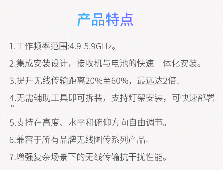 1. 工作頻率范圍:4.9-5.9GHz 2. 集成安裝設(shè)計(jì),實(shí)現(xiàn)與接收機(jī)與電池的快速一體化安裝 3. 無需輔助工具即可拆裝,支持燈架安裝,可快速部署 4. 支持在高度、水平和俯仰方向自由調(diào)節(jié), 5. 適用于所有品牌無線圖傳全系列產(chǎn)品 6. 增強(qiáng)復(fù)雜場景下的無線傳輸抗干擾性能 7. 提升無線傳輸距離最遠(yuǎn)達(dá)2倍